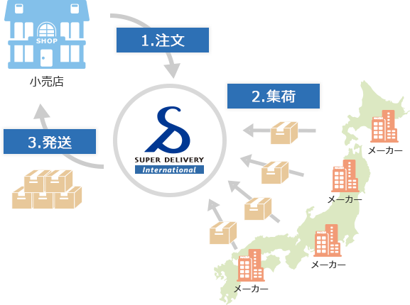 各メーカーからスーパーデリバリーの倉庫に商品が送られます。