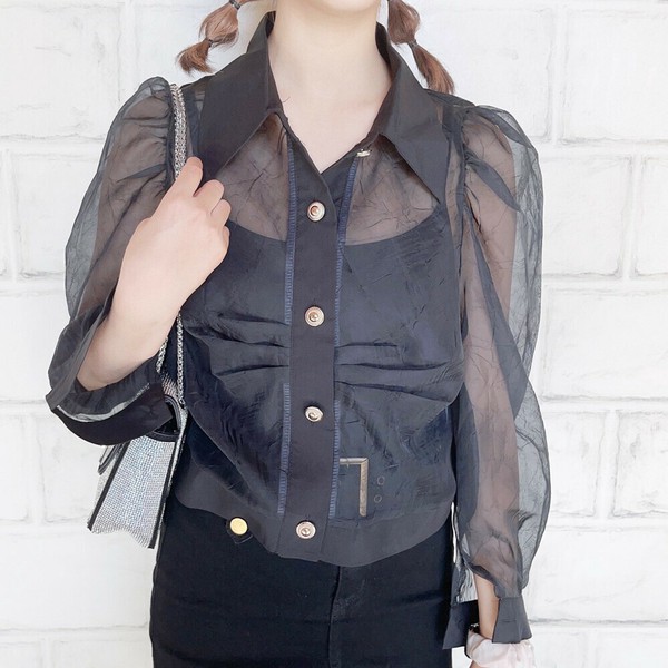 Bicolor Sheer Blouse Top Jacket [[123-7683]] Transparent sheer material color scheme blouse ♪ Moderately taut, three-dimensional puff sleeves, soft and gentle. The color scheme gives a mature impression *. Because it opens in the front, you can use it as a blouse or as a woven top. You can enjoy a wide range of coordination with denim and skirts (#^^#) *Because the material is transparent, please wear an inner layer such as a camisole, tank top, or bare top. Please wear an inner layer. *This item may feel a little small due to its line-flattering design. |