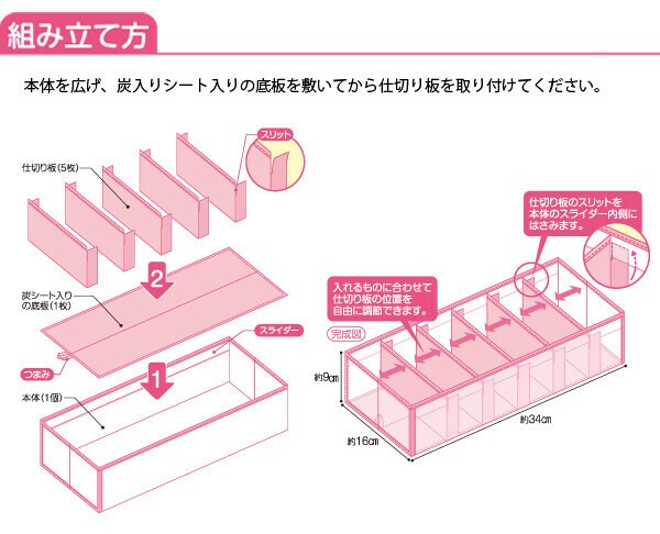 *After spreading out the main body and laying down the bottom board with charcoal sheet, attach the dividing board. [Caution] *Please be careful not to expose it to direct sunlight for a long period of time, as it may deteriorate. *Please note that the non-woven fabric may tear under strong tension due to its nature. *Please avoid washing. *Please avoid using it near fire. *Please do not use it for any purpose other than the intended use. [Care Instructions] *Wipe with a clean cloth when soiled. |
