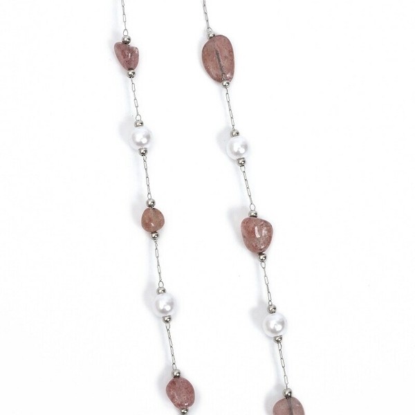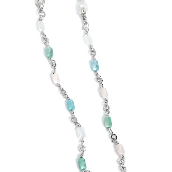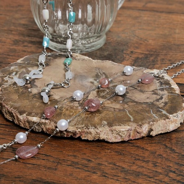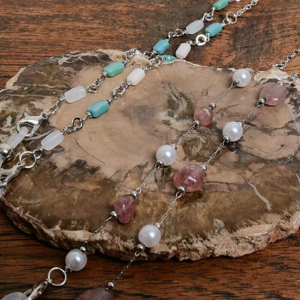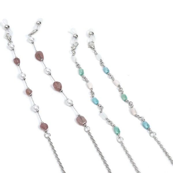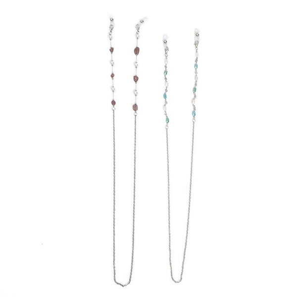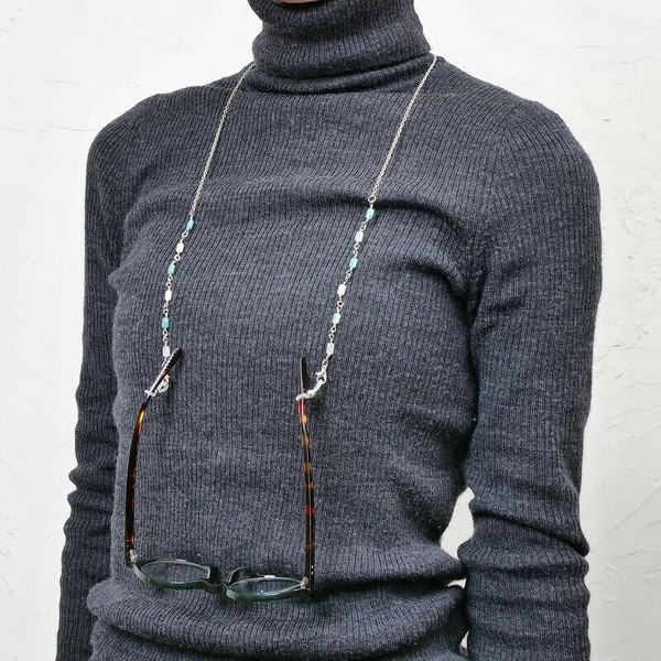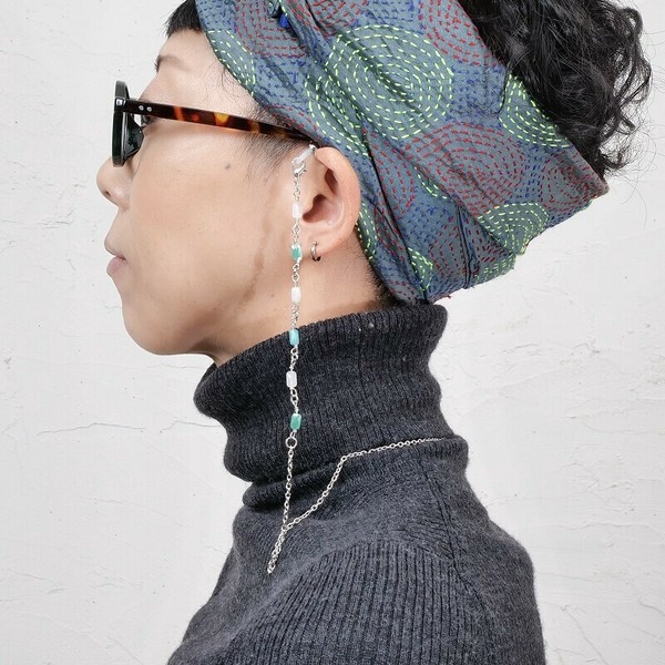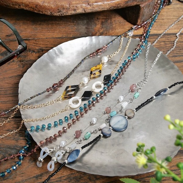 A simple yet sophisticated design with two types of beads alternating, each with a different bead shape and arrangement. Since only a chain is used around the neck, it does not get caught in the hair. The beads sway around your ears as if you are wearing long earrings. Since it can be left hanging around the neck, it is a convenient item that prevents falling or losing it, and it is easy to place it when putting on and taking off the glasses repeatedly.