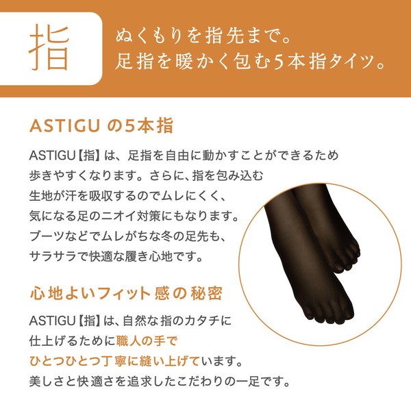 〜ASTIGU 〜 [自由穿着] 朴素的紧身裤,让你的每一天都充满活力。 [产品介绍] [手指] 5指80旦紧身裤 温暖直达指尖。五指紧身裤让您的脚趾温暖如春。 穿着方便,双腿舒适。 脚趾牢固地张开,不会粘在一起,冬天容易潮湿的指尖也能保持舒适干爽。 15 趾紧身裤的美观与舒适 为了确保穿着舒适,工匠们将这些五指紧身裤一针一线精心缝制。 指尖可以自由活动,每根手指都自然结实,让您走起路来美丽潇洒。 我们建议您在度假等经常行走的日子穿着! 包裹手指的织物可以吸收脚汗,因此不会潮湿,还能有效防止脚臭。 它很容易与高跟鞋、运动鞋搭配,当然也可以与塔比靴搭配,让您穿出自己喜欢的风格。 2 具有高功能性发热效果的保暖功能 〜激光加热(光加热) 面料中的陶瓷能吸收阳光中的近红外线,并将其转化为热能。 它能迅速温暖身体,让您舒适一整天。建议在户外活动时穿着。 380 旦保暖型 这款 80 旦面料质地深厚、丰满,重量适中。 这款产品保暖性好,不透光,也不太重,建议日常使用。 4独创背标,让您一目了然今天要穿哪件衣服。 原创背标上设计有产品名称和丹尼尔编号。 您可以快速找到自己想穿的那双,享受与当日流行时尚相匹配的穿着体验。 5 单手包装,方便取出 纸质包装具有可持续性,易于打开,避免了过度包装。 紧身裤比以往更容易取出,在忙碌的早晨节省了时间。 *防静电处理]防止粘附衣物 *采用[Dia Gusset(R)]设计,更加贴身舒适 [搜索词]连裤袜,1 双,防寒保暖:1580 AP1580(原商品编号:AP1280) |