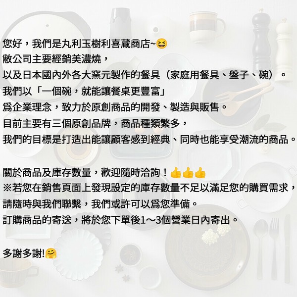 [特点*其他] *可放入微波炉加热(仅用于预热) *不可放入洗碗机清洗 [注意事项] 请注意,由于产品特性不同,尺寸和容量可能略有差异。 由于产品的性质,可能会有一些刮痕和响声。 根据生产时间(批次差异),产品颜色可能会略有不同。 产品图片仅供参考。 为提高质量,产品规格如有变更,恕不另行通知。 请在购买前了解陶器的特性。 由于产品的特性,我们不接受任何原因的退换货(尺寸错误、订单错误、图片错误等)。 由于您的显示器设置、室内光线等原因,产品的颜色可能会与实物不同。 |