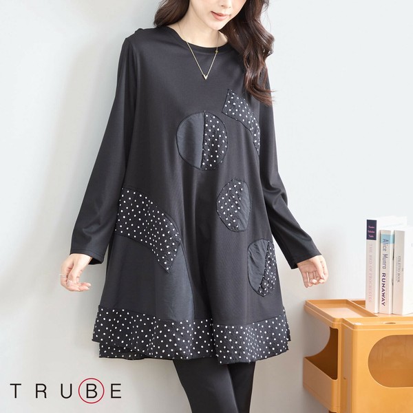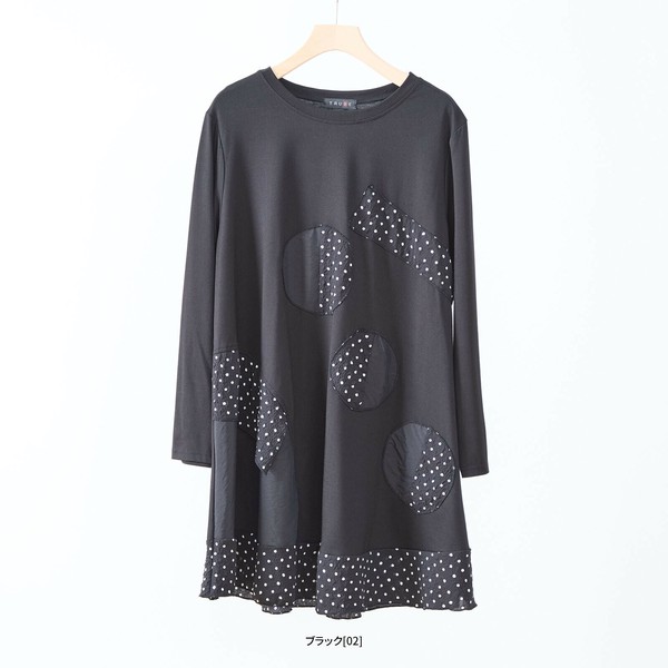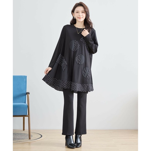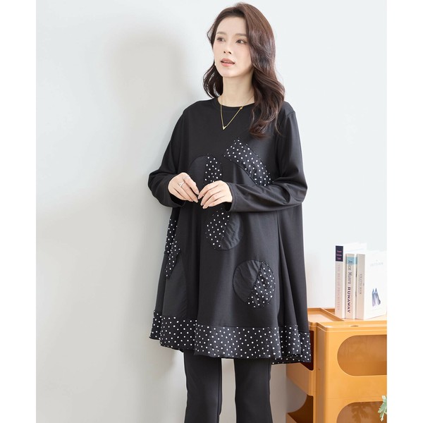 This tunic has an appealing polka dot pattern switch design that looks great on a monotone base. The relaxed A-line silhouette is decorated with round and diagonal dots, creating a natural and unique impression. The dot frills at the hem lightly tighten the overall impression, making even simple coordination with pants instantly glamorous. This piece is recommended for the wardrobe of adult women, offering both figure coverage and design.