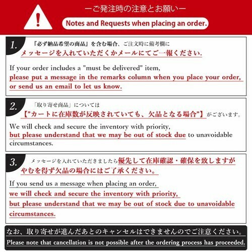 请注意,由于不可避免的原因,产品可能会缺货。 *请勿在下订单后取消或更改产品。 [关于运费的说明]*由于订购商品不足,一次发货总额不足 30,000 日元时,将产生运费。 [运费注意事项]*因订购商品不足,一次发货总额不足30,000日元时,将产生运费。 从 2020 年 6 月起,您包裹中的送货单格式将改为[送货单上无清单价格和送货地址*TEL]。对于要求在附带发票上注明[清单价格等]的商店,可在包裹中附带[附带清单价格等的常规发票]。 [如果您希望一起发货,请在同一天在第 1 家和第 2 家商店下订单,并在备注栏中注明何时发货。如果您希望将订单一起运送,请在同一天在第 1 家和第 2 家店铺下单,并在下单时在备注栏中注明。 *关于运费:第 1 家店铺 + 第 2 家店铺 → [商品小计(*不含税)] 30,000 日元或以上(免运费) 请注意,我们的工作人员将在[商品小计(*不含税)] 30 000 日元或以上时处理免运费事宜。请注意,我们的工作人员将在 [发货时间] 处理免运费事宜。 *屏幕上已显示新价格。 |