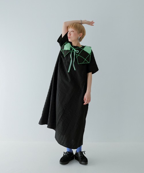 The wavy pattern makes a strong impact in the city! Silver piping adds a stylish touch, making the design stand out. The flowy silhouette is perfect for summer resorts.