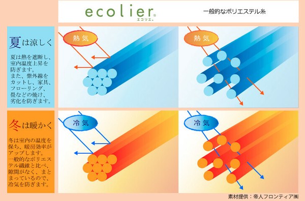 *Ecollier, a special functional yarn produced by Teijin Frontier, is knitted into the fabric at the same time, and the knitted structure is made very dense to achieve extremely high functionality. With a high level of performance of 33.7% in heat insulation and 28.3% in heat retention, these mirror lace curtains are eco-friendly and energy-saving all year round, which also saves on electricity bills.