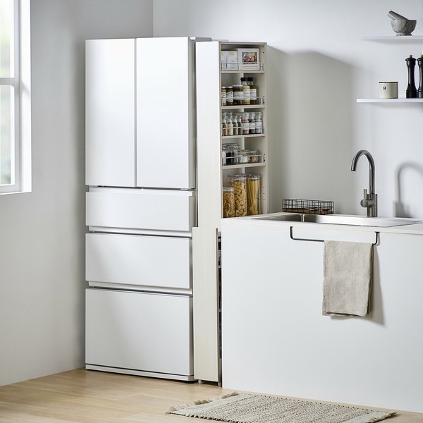 *这款储物架可有效利用厨房中的小缝隙。深度约 44.5 厘米,小巧易用。建议在冰箱旁边使用高型。上下分层设计,上层较深,便于打开冰箱门。它节省了空间,可以放置很多东西,如调味品、厨房用纸和塑料瓶。前面板和下顶板采用防刮防污的三聚氰胺层压板制成。上面两个搁板是活动的,您可以根据需要存放的物品进行调整。附有把手,便于拉出。配有脚轮,可以轻松拉出并平稳移动。您可以选择左侧或右侧取出并组装。需要客户组装。 *承重能力(约):总承重 30 公斤,固定搁板承重 5 公斤,活动搁板承重 3 公斤,底板承重 8 公斤 *搁板最小内部尺寸(约):顶部搁板102 x 366 毫米,底层搁板:106 x 412 毫米 |