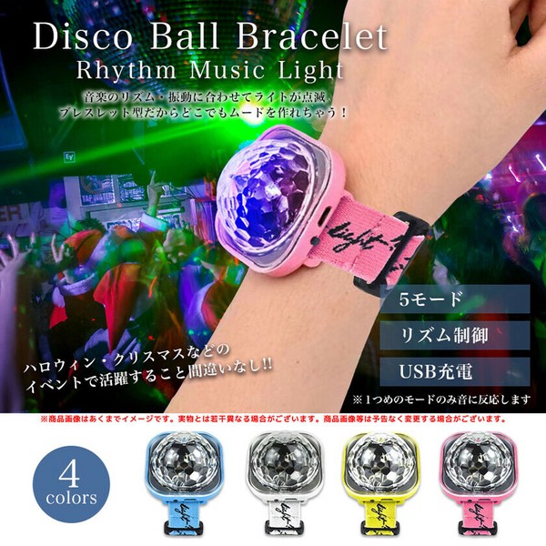 Mirror ball bracelet 音楽のリズム・振動に合わせてライトが点滅♪ ブレスレット型だからどこでもムードをつくれちゃう! ハロウィン・クリスマスなど、イベントで活躍すること間違いなし! USB充電 |
