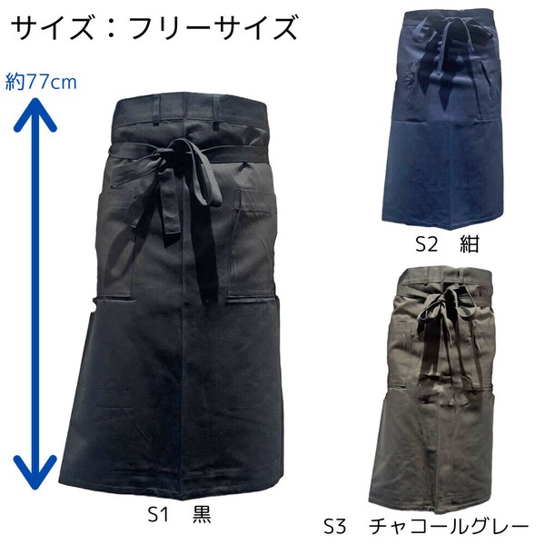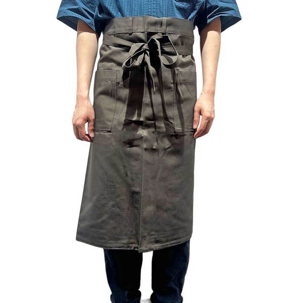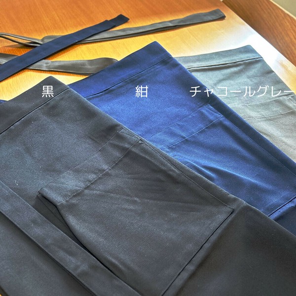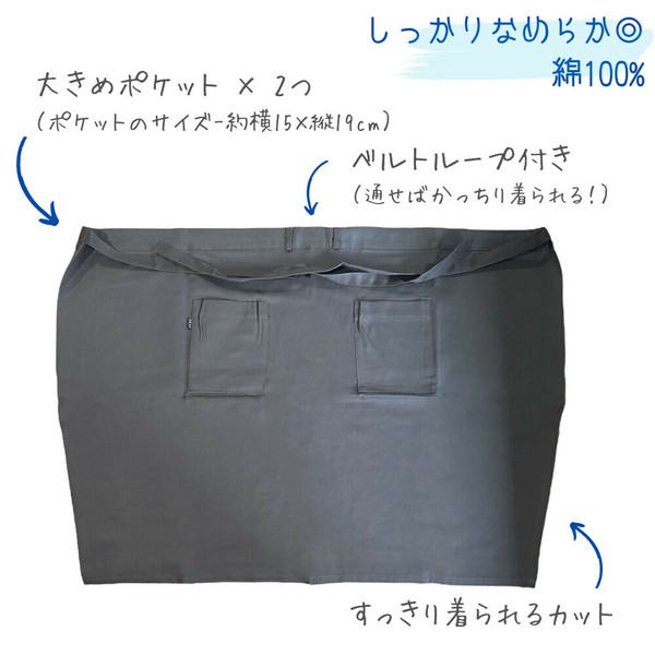 ラフに紐を前で結んで着てもいいし、ベルトループ付きなので、紐を通してかっちりとも着られます。 大きめのポケットが左右1つずつついているので、作業時の収納性も高くお役立ち! 仕上がりの長さ約77cm、性別を問わずお使いいただけます。 |