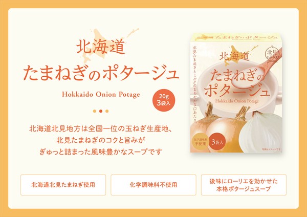 北見たまねぎとミルクのまろやかな口当たり。 北海道北見地方は、全国1位の玉ねぎ生産地!北海道北見たまねぎのコクと旨みをぎゅっと詰め、ミルクのまろやかな口当たりを合わせた、風味豊かなたまねぎポタージュです。
