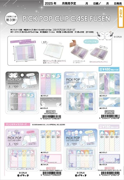 持ち運べる便利付箋登場! 《2025年5月中旬頃発売予定》 【必ずご確認ください】 ご予約品はメーカーの生産数に達しました時点で、 受注数量の変更もしくは予約受付を終了する場合がございます。 必ずしもご希望数をご用意できる確約ができません為、 事前にご了承頂きました上でのご予約をお願い致します。 即納品と予約品を一緒にご注文頂いた場合、納期が異なる商品は同梱での発送はできません。 ※入荷済みの予約品の取り置きのご対応もできませんことご了承ください。 ご発注時に合計¥15000(税抜き)を超えていても、 発送日が異なる即納品と予約品は注文合計となりませんので【¥15000(税抜き)以内】であれば送料を頂く形となります。 上記につきまして、ご理解ご了承の上、ご購入・ご予約ください。 こちらは【PICK POP クリップケースフセン】 クリップが付いてて持ち運び便利です。 大・小とサイズあるので使いたい用途に合わせてお使いいただけます。 付箋小4柄×各20枚 大1柄×20枚(計100) ■サイズ:約55×75×10mm ■素材:ABS樹脂・PP ■一点あたり上代:480円(税抜き) 2025新作 注意事項を必ずお読みの上、ご予約下さい。 ※予約品の為キャンセルはお受けできません。 充分にご検討の上、ご注文いただきますようお願い致します。 ※デザイン・仕様・発売日など予告なく変更、または販売中止になる場合がございます。 ※商品入荷後、ご連絡の上、出荷させていただきます。 本品は一般売りを目的とする商品で有り、景品目的とした商品ではございません。 キャラクター商品は海外販売禁止(日本国内販売のみ)となっておりますことご了承下さい。問題が発生しましても弊社では一切責任は負えませんので、ご了承下さい。 The genuine article is intended for general sale and not for prizes. Please note that character products are banned from overseas sales (only available in Japan). Please note that we cannot be held responsible for any problems. |