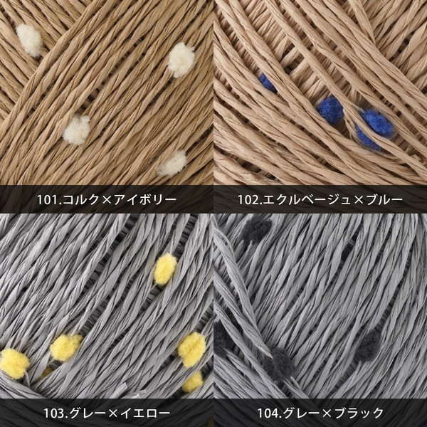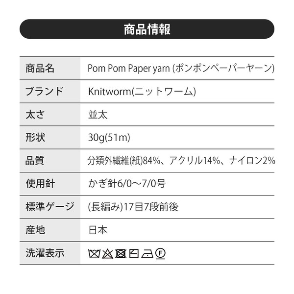 商品名 Pom Pom Paper yarn ブランド Knitworm 太さ 並太 形状 30g(約51m) 品質 分類外繊維(紙)84%、アクリル14%、ナイロン2% 使用針 かぎ針6/0〜7/0号 標準ゲージ (長編み)17目7段前後 原産国 日本 人気のペーパーヤーンにカラフルなチョウチンモールを撚糸したタイプが新登場!!シンプルな素編みをするだけで、チョウチンモールのポンポンがアクセントになった可愛い作品が出来上がります。ポンポンの出る間隔や大きさなど、ちょうど良いバランスで配置されるように何度も試作を重ねました。ベースのペーパー部分は従来商品の「ペーパーヤーン」と色を合わせているので、組み合わせてお使いいただくことも可能です。 ※作品の編み図は「あみものブック#20」に掲載されています。 |