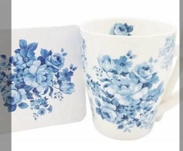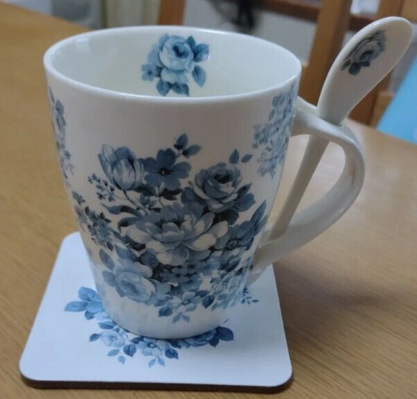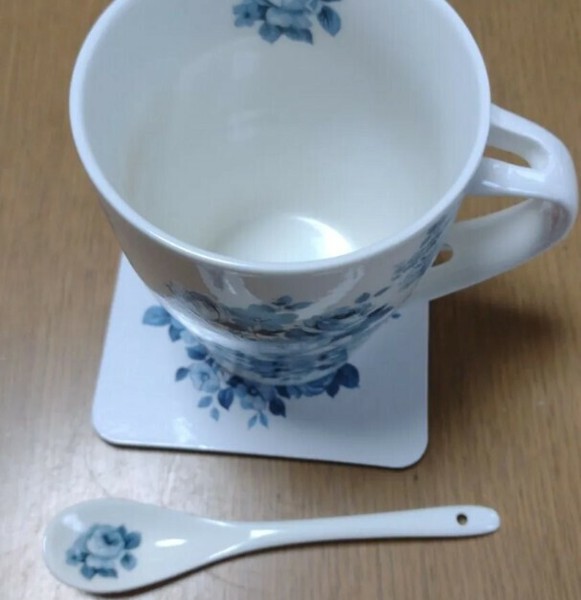 同じ柄がプリントされたスプーンとコースターが付いています! あなたもちょっとした優雅なティータイムを過ごしませんか? 贈り物にも最適です!電子レンジも使用可能ですので大変便利です。 ※容量:320ml、電子レンジ使用可 バラ、薔薇、ばら、皿、デッシュ、食器