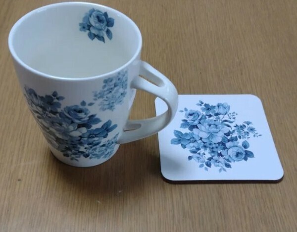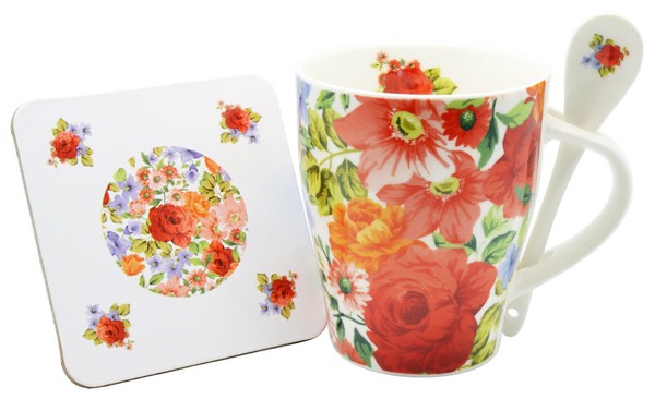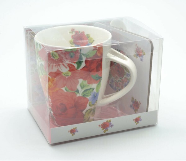 かわいい!絵柄をプリントされたおしゃれなマグカップです! 同じ柄がプリントされたスプーンとコースターが付いています! あなたもちょっとした優雅なティータイムを過ごしませんか? 贈り物にも最適です!電子レンジも使用可能ですので大変便利です。 ※容量:320ml、電子レンジ使用可 バラ、薔薇、ばら、皿、デッシュ、食器